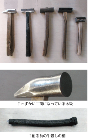 釘を打ったり、ノミを叩いたりするのに使う大工道具の「げんのう」。玄能または玄翁とも書き、生殺石を砕いた玄翁和尚に由来していると言われています。 玄能は金づちの一種で、主に両側が打面になっている物の事を言います。先端の両方が平らに見えますが、片側は普通に釘を打つための平面、反対側は出っ張った曲面になっています。木に傷を付けない為の作りで、「木殺し」と呼ばれ、最後の一打ちに使われます。 玄能の種類は断面が丸、四角、八角など、対称の形をした両口玄能と 、片方が尖った片口、舎型、舟手型など多岐に渡ります。また、関東は両口、関西では片口が多く見られるなど、地域によっても違いがあるようです。 柄もカーブの付いたものと、まっすぐなもの、素材も白樫やグミなど様々なものがあり、自分の使い勝手や用途に合わせて槌と組み合わせることが可能です。柄は木の状態で買ってきたものを、自分で削って使います。皮の部分を残したり、模様を刻んだりする職人もいます。 右下の写真は米澤工務店で実際に職人が使用している玄能です。槌も柄も様々で、一番右の小さいものはダルマ玄能と言い、ノミを打つのに使われています。柄の部分は牛殺しと言う木が使われており、牛の鼻輪を通す時、穴をあけるのに使われるほど丈夫な木でできています。左端はヤマキチ玄能と言う九州の玄能で、普通(真ん中の3本)の玄能より平たくなっています。左から二番目はゴムの柄になっており、握力が弱くても簡単に打てる構造です。 このように職人それぞれがこだわりの道具を使って、日々の作業をしています。 |