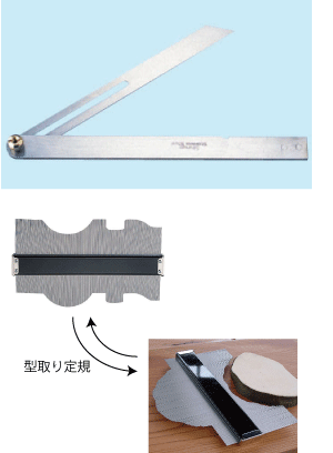 自由金は文字のとおり自由に動く二枚の金属性板を、角度を写し取りたい場所に合わせ丁番で締め付けて固定し、必要な角度を写し取る便利な道具です。