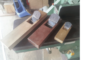 木材の表面を削り平滑に整える大工道具「鉋(かんな)」。鉋はどこの鍛冶職人や工場が作ったかわかるように種類毎に名前が付けられており、鉋刃と裏金を密着させて使う2枚鉋が一般的です。 台(鉋の木の部分)は樫等の硬い木で作られています。鉋刃も、地金と鋼の二種類で構成されておりこの鋼の種類によってその鉋の特性や切れ味が大きく左右されます。長い木材をまっすぐ仕上げる為に台が長くなっている長台鉋、丸太などを削る為に鉋台が局面になった反り台などもあります。海外では木材が硬いため鉋を押して使いますが、日本では杉・桧などの柔らかい木材が主流のため、引いて使うように造られています。 鉋は刃を自分で研ぎ、台も刃も調整が必要なデリケートな道具なのでもっとも大工の「職人」としての腕が問われます。熟練の職人になれば、長い木材も鉋屑を途切れさせることなく鏡のように仕上げることが可能です。 写真は社長の鉋で小さいのが木の切断面を削る「小口鉋:兼定」、真ん中が一般的な鉋で「寸八鉋:山城守」、一番長いのが特注で鍛冶職人に作ってもらい社長の名前、寿人から命名した「長台鉋:寿」です。 |