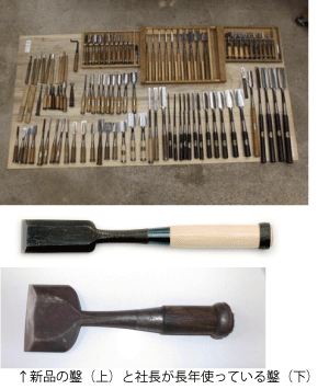 昔ながらの大工道具の一つに「のみ(鑿)」があります。のみは木材に穴をあけたり削ったりするのに用いますが、手入れが非常に難しい道具なので、のみの手入れの状態で大工の腕が判断できるとも言われています。 のみはシンプルな道具に見えますが、良い状態にするには刃を研ぎ、裏(刃の裏側)を整え、かつら(柄の金属部分)を削る等と手間を掛ければいくらでも掛けられる道具になります。大工が使用する一般的なのみは「追追入のみ」と呼ばれる細かな部分を加工するもので通常1組10本セットになります。 当社の現場担当はそれぞれが専用ののみセットを所有していますが、さらに社長・専務・佐藤・大槻はより大きい「叩きのみ」も所有しています。叩きのみはより大きな柱や梁などを加工するために作られたのみで一本一本バラ売りもあれば銘柄をそろえたセット品もあり、今ではなかなかお目にかかれません。のみは使う大工のこだわりでもあり社長は自分で特注した刃幅が70oもあるのみを使用し、専務は気に入る叩きのみが見つからず行商している金物屋に頼み1年かけて新潟は越後で6本組の叩きのみを見繕ってもらうほどでした。 のみの柄にあたる部分も通常は「赤樫」の木で作られますが、大槻が使用している柄は「黒檀」という非常に硬い木で作られています。仕事でも道具でもこだわりを持つことが職人の特徴かも知れません。 |
