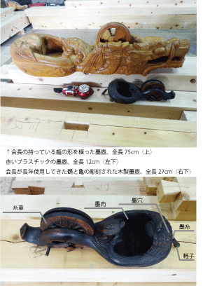 大工道具の墨壺をご紹介します。墨壺は材料に直線を打ったり、墨差しを使って字を書くときに使う道具です。その歴史は古く、エジプト時代から使われていたとも言われています。現代でも使われている墨壺と糸と糸車のすべてを一体化したものが中国で考えられ、日本では法隆寺に使われている最も古い材料に、墨壺を使って打ったと思われる墨線の跡があり、この時代から使われていたとされています。墨壺には、昔から親しまれてきた木製と使い勝手を向上させ現在の主流となっているプラスチック製あります。 墨壺は「糸車」「墨穴」「墨肉」「墨糸」「軽子-かるこ」、「廻手-かえで」などの部分からできています。木の墨壺は実用的な物から巨大な物まであり、彫刻が施されているものが多く高級品はもはや工芸品であり見た目にもとても綺麗です。プラスチックでできた墨壺は木で出来た墨壺とほぼ同じなのですが木で出来たものとの違いは「廻手」がなく、自動で墨糸を巻き取ることができます。デザインも木製に比べてシンプルで持ち運びか楽にでき、値段も安価です。墨壺は墨肉に水と墨を入れ使用しますが、この時墨を入れすぎないよう注意が必要です。墨を入れすぎてしまうと墨糸にたくさん墨がついてしまい、材料に墨を打つ時に墨がにじんだり飛び散り汚してしまうからです。墨壺は軽子(糸の先端にあり針がついている部品)を材料に刺し墨壺本体を持って糸を引出しながら移動した後に、本体を材料に押し付けてピンと張った糸を弾きます。この動作から墨壺を使う時は線を引くのではなく「打つ」と大工は表現します。 他にも墨差し(竹を割って加工してヘラのような形をしたもの)を墨肉につけて字を書いたりして使います。現場では精度はもちろん強度も求められますので、約0.6oの糸を使用するのが一般てきですが、技術を競う大会などでは何より精度を求めます。0.6oの糸で墨を打つと墨の右と左で最大0.6oの誤差が出ます。よって大会では30番〜60番のミシン糸に張り替えて使用する大工もいます。 |