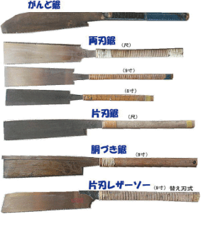 柄にはキリなど軽い材が使われています。すべり止めに籐を巻いたもの、プラスチック製やゴム製など取り換え式の柄も各種あります。現在では目立ての煩雑さや目立て職人の減少から、替え刃式が主流になっています。 日本の鋸は手前に挽いて切ります。部材の繊維方向によって縦挽き、横挽き、使用目的が異なる両刃、畔挽き、挽きまわしなど、さまざまな種類があり、用途によって使い分けます。当社では毎年「子ども木工教室」、市から依頼された年は「女性の大工塾」で皆様に体験して頂く機会を設けておりますが、まっすぐ線を引いて、その通りに切ることは難しいと実感される方も多いと思います。 |