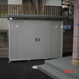 ![]() 外にある、防災倉庫。非常時に必要なものをしまってある倉庫です。 |