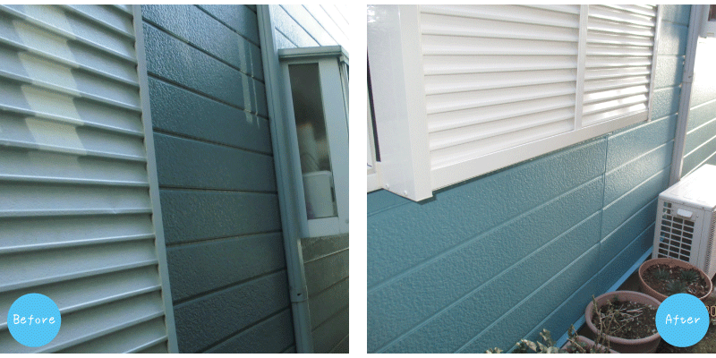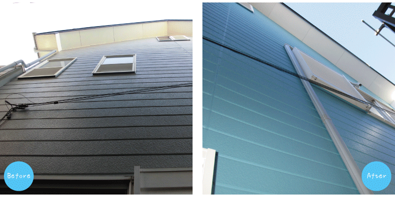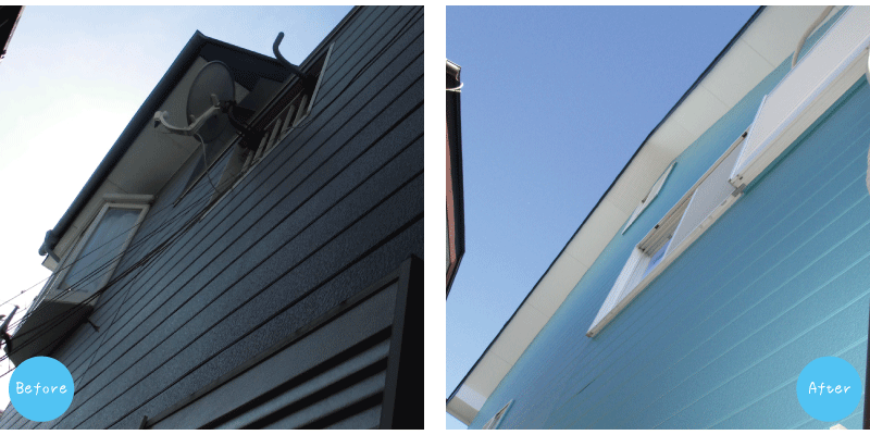 ![]() 窯業系サイディングに日塗工の塗料を塗りました。屋根同様、高圧洗浄機で汚れを落とした後、下塗りを2回行い、最後に上塗りをします。 汚れも落とし、窓まわりをホワイトにしたことで、外壁の明るい水色がより映えるようになりました。 |