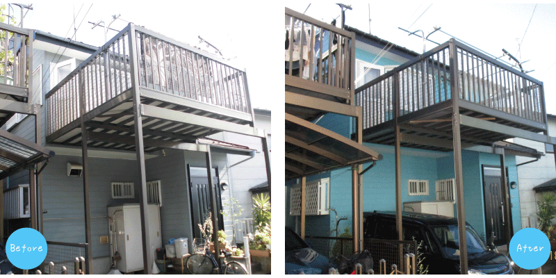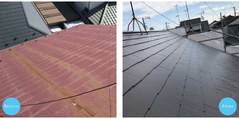 ![]() 塗装工事を行う前は、屋根自体の色あせ、土埃、経年劣化、それとTVアンテナの錆の流れだし等で汚れていました。 工事の作業工程として、高圧洗浄器で汚れを落とした後、下塗りを2回行い、最後に上塗りをします。 今回、屋根の塗料には「ヤネフレッシュ:半艶」を使用し、色も濃いブラウンに。 ヤネフレッシュは、優れた隠ぺい性、高耐久性、防かび・防藻性、優れた密着性を兼ね備えた塗料ですので、塗装後はお客様にご満足して頂ける見栄えになりました。 |